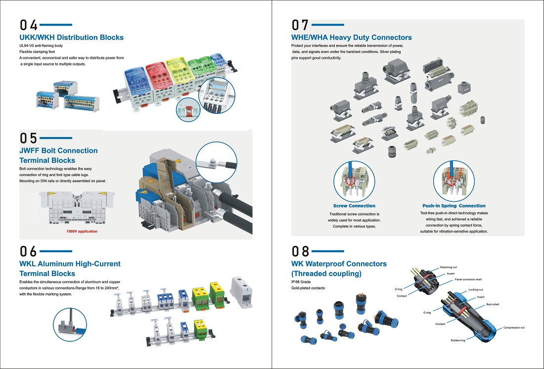 На этой выставке WKDQ представит восемь серий клеммных блоков, а именно JUK, JUT, JPT, JPTV, JST, JPTFIX, JPTIO и UKK. Благодаря высокой надежности, превосходной устойчивости к воздействию окружающей среды и гибкой адаптируемости эти продукты могут широко применяться в различных сценариях, таких как промышленный контроль, интеллектуальные устройства и новая энергетика. Они предоставляют клиентам по всему миру комплексные интегрированные решения для электрических соединений — от исследований и разработок, проектирования до производства и внедрения — помогая клиентам повысить эффективность производства и конкурентоспособность продукции.