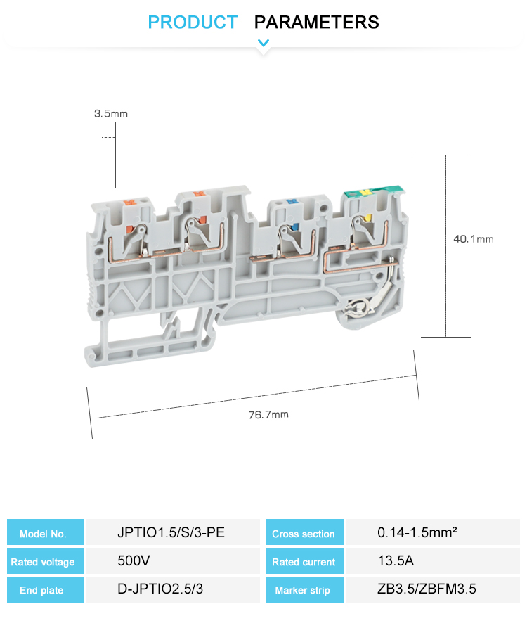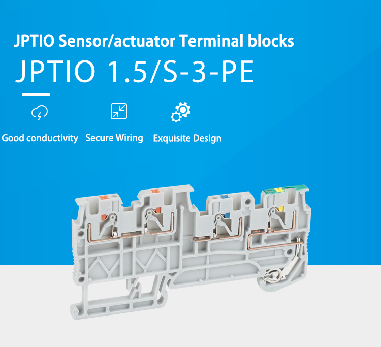 JPTIO1.5/S/3-PE «клеммная колодка» «клеммная колодка» изготовлена из огнестойкого нейлона PA66, латунного проводника и пружины сжатия из нержавеющей стали, что обеспечивает электрическую безопасность и механическую прочность в тяжелых условиях работы.